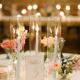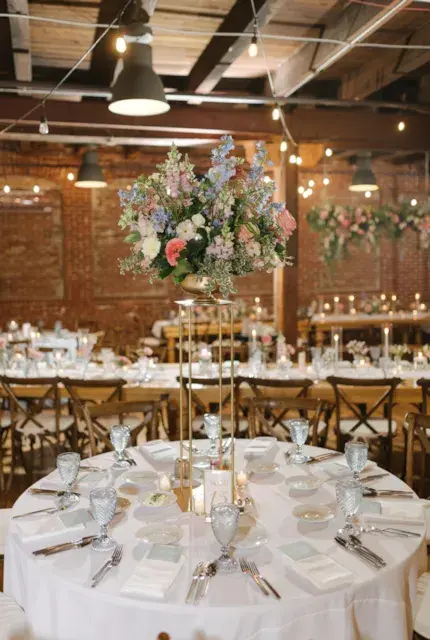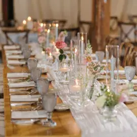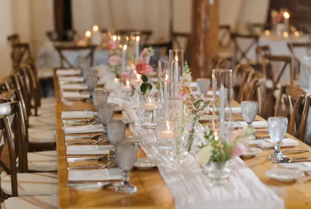 Design choices enhanced the natural beauty of The Heirloom. Our in-house farm tables and vineyard cross-back chairs offered a relaxed, curated aesthetic. Rented white Sahara runners, dusty wedgewood linens, and blue Carousel goblets added character while keeping the overall look timeless. Candlelit votives and pastel florals at every table created an intimate glow that carried through the evening.